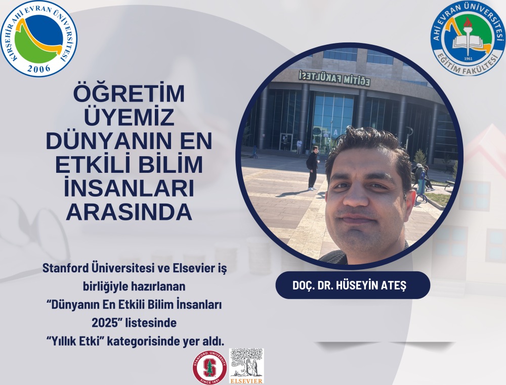 Stanford Üniversitesi ve Elsevier iş birliğiyle hazırlanan 2025 yılı “Dünyanın En Etkili Bilim İnsanları” listesi açıklandı. Listede, Kırşehir Ahi Evran Üniversitesi Eğitim Fakültesi öğretim üyesi Doç. Dr. Hüseyin ATEŞ, “Yıllık Etki” kategorisinde yer aldı.